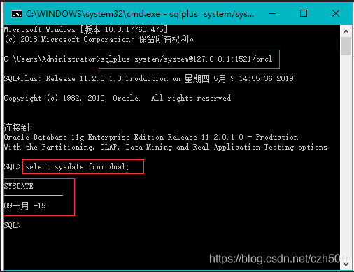SQL plus连接远程Oralce数据库: Windows系统,输入cmd,进入命令行程序。 sqlplus 用户名/密码@服务器IP地址:1521/orcl.