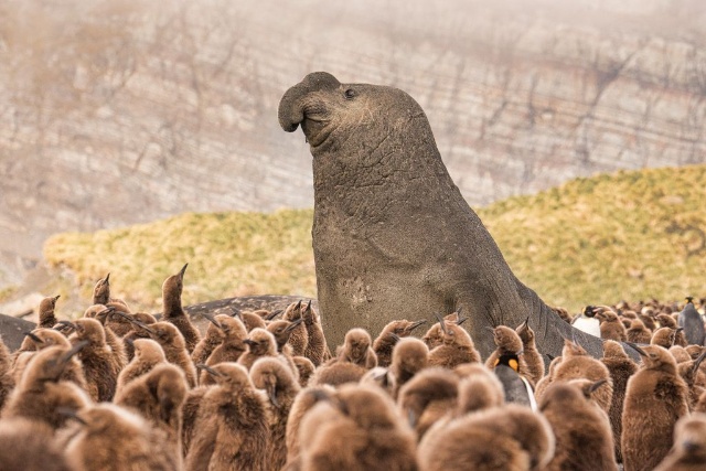 ペンギンの子に囲まれるゾウアザラシ ナショナルジオグラフィック日本版サイト
