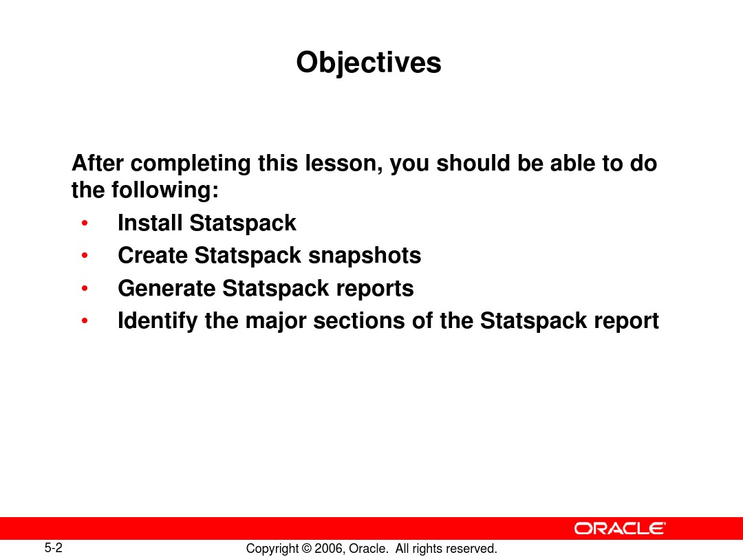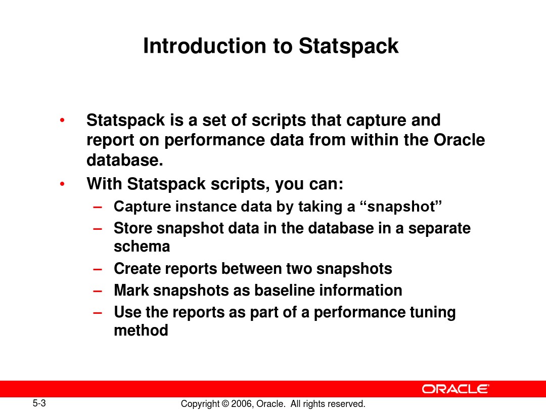 These utilities capture elapsed time statistics for over 100 performance metrics. Statspack stores the performance statistics permanently in Oracle tables, which can later be used for reporting and analysis. Oracle database - File (Common Specification for data file, control file,) Oracle Database - File System;.