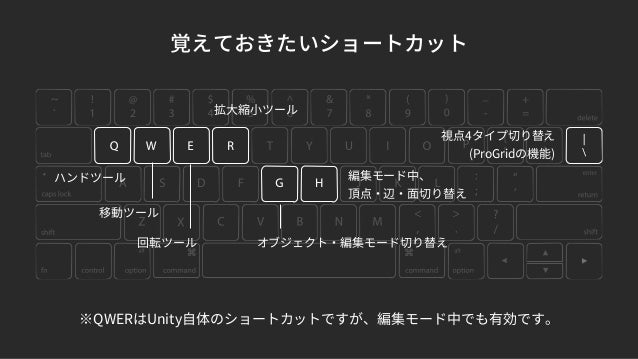 Q:ハンドツール W:移動ツール E:回転ツール R:拡大ツールマウス右ボタン+W:ビューを前に移動 マウス右ボタン+A:ビューを左に移動 マウス右ボタン+S:ビューを手前に移動 マウス右ボタン+D:ビューを右に移動オブジェクト選択状態で F:オブジェクトを中心に拡大 Alt+左ドラッグ. Unity はほぼ毎日利用しているので、ショートカットキーを覚えたら作業が少し快適になるかなーと思ってまとめてみた。Unity Editor 上のショートカットキー一覧メニューで指定されているものを一覧で掲載してみる。なんでもかんでもショー. Unityのショートカット一覧 Ubuntu 11.04以降、デフォルトのデスクトップ環境として『Unity』が利用できるようになりました。 この文章は、Unity独自の機能を含む、Ubuntu 11.04の各種機能を利用するための、キーボードショートカット・マウス操作を掲載したもの.