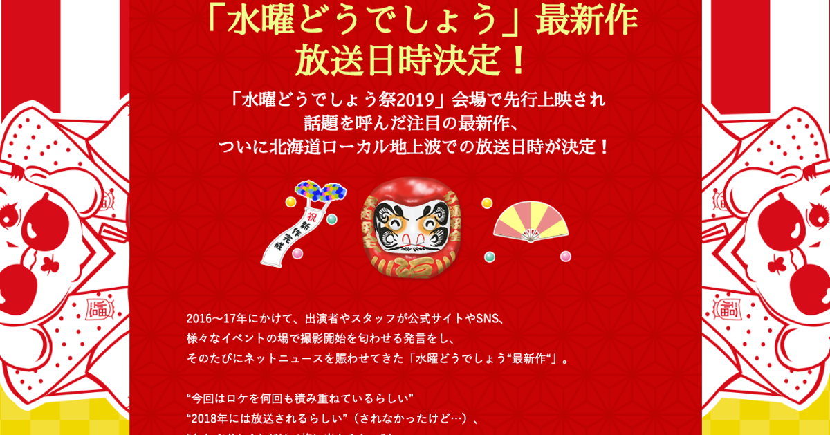 北海道で本日10月28日23:15に放送開始となるTV番組『水曜どうでしょう』最新作。その各地での放送日をまとめています。 HTB以外で放送されるのは、IAT 岩手朝日テレビや、YTS 山形テレビ高知など全16局となっています. 北海道のローカル番組でありながら、今や全国に数多くのファンを持つ 「水曜どうでしょう」の最新作の放送が決定しました。 前作「原付日本. (日) 15:17:53.98 ID:mSfQIxwop あと一つは? 引用元:.